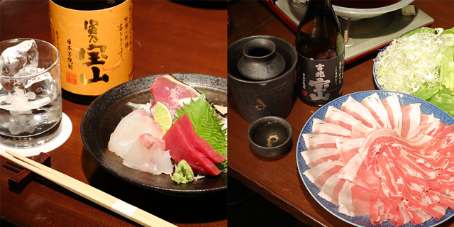 私たちは味を“同調”させることを大切にする、「お酒と郷土料理のマリアージュ」をお客さまにご提供しています。例えば、西農園さんが提供されている「黒宝豚」を使った“しゃぶしゃぶ”は、少し醤油を入れたかつお出汁でさっぱりとお召し上がりいただけるため、「富乃宝山」のロックやソーダ割りがピッタリですし、「黒宝豚」をミンチにして照りダレで焼いた“つくね”には、脂の豊かな旨味と甘味が凝縮されていて、ものすごくジューシーですので、「吉兆宝山」をお湯割りでいただくと、よりまろやかな味わいを愉しめると思います。