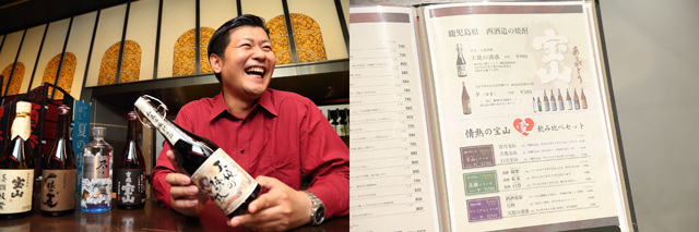 6年前、店の改装に合わせてメニューを変えた際、私が好きな焼酎銘柄に注力する方針にしました。造り手のこだわりや焼酎そのものの個性・特徴がお客さまに伝わりやすい銘柄を選ぶようにしていて、その代表格と言えるのが「宝山」です。正直なところ、私自身はもともと日本酒が好きで色々な銘柄を飲んでいます。焼酎もいろいろな銘柄を飲みましたが、最近では、ほとんど宝山しか飲みません。宝山に出会ったのはお酒が本当に好きになった頃のことですが、味覚やお酒に対する感性が変わってきたことで、時が経つにつれ、宝山の“深みのある味わい”も感じられるようになりました。