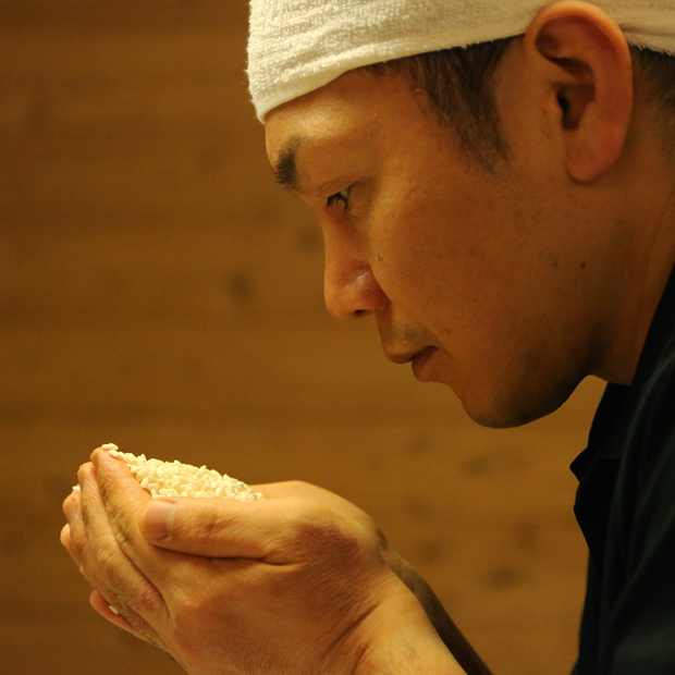 ご紹介の写真は、温度・湿度管理が行われている麹室(こうじむろ)の中で、蔵人が麹の出来具合を確認している様子です♪ お米の表面が白く化粧した様に見えるのですが、これは破精(はぜ)と言って、蒸したお米に麹菌がしっかりと繁殖している証拠なのです(*´ω`*)