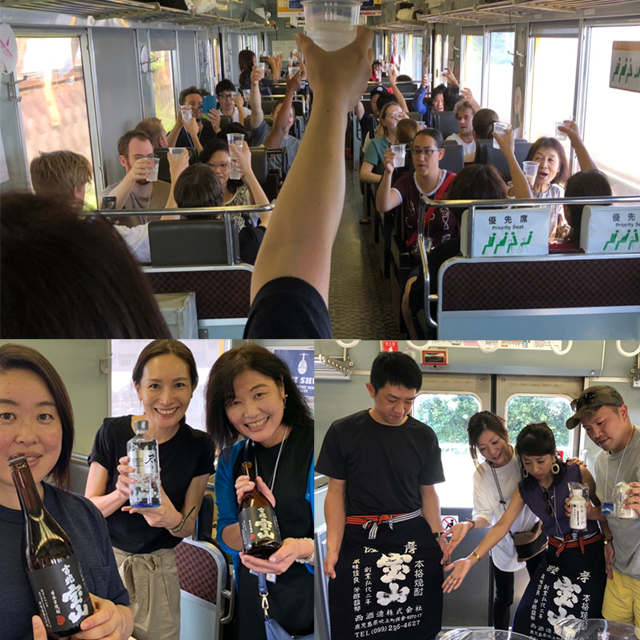 列車内では、日本芋焼酎「宝山」、ジャパニーズクラフトジン「尽~tsukusu~」、米麹と天然水のみでつくった「家族の甘酒」が飲み放題!西酒造の蔵人がおすすめする、夏にぴったりの呑み方でお愉しみいただきました♪(‘ω’)ノさらには、鹿児島産の旬の食材をたっぷり盛り込んだ灰干し弁当をご用意しました。( *´艸`)当日はお天気にも恵まれ、雄大な桜島を眺めながらたくさんのお客様で、終始笑いの絶えない夏旅になりました。(^_-)-☆