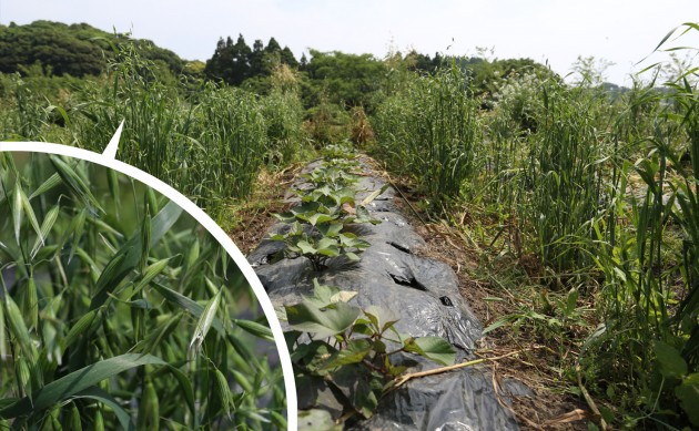 5月9日のポストでご紹介しました、試験農場の一区画「大根畑」の後に植えたお芋が元気に育ってきました。この写真から、お芋の両脇に背の高い草が生えているのが見て取れると思いますが、実はこれ雑草ではなく、「エンバク」といって麦の仲間なんです。(^ー^)ノ このエンバクが芋畑に隙間なく生えている事で、余計な雑草が生えて来るのを防いでくれます。お芋の収穫時期には枯れてしまいますが、お芋が収穫された後に、このエンバクをそのまますき込む事で、土を柔らかくしてくれる効果まである、とてもありがたい存在です。(*´∪`*) 試験農場ではこのような少しユニークな農法の試験も行っています。今後も私たちが行っている試験内容を適時ご紹介させていただきます!