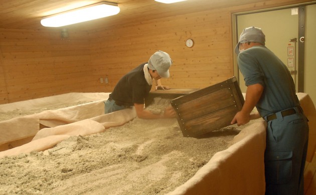 麹室で丸一日寝かされた米麹を、杜氏達が集めています。(*^_^*) 昨日に比べて、米麹がうっすら黒く変色しているのをご確認いただけますでしょうか。米麹が“はぜる”とは、蒸した米に麹菌がしっかりまとわりついた状態を言います。こうしてできた米麹はここから甕に移され、仕込み水・酵母といっしょになり、いよいよ一次もろみ仕込みへと進んで行きます。長い長い焼酎造りの道のりの、大事な第一歩をクリアーしたというところでしょうか。ε-(´∀`; )