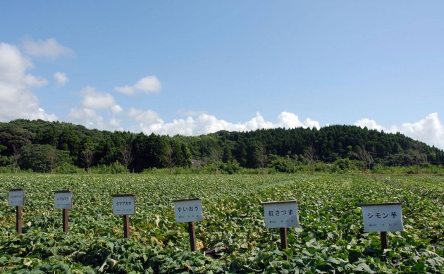 ここでは薩摩焼酎の原料に適した新しい芋を開発するため、常時およそ34種類の芋が育てられています。(^_^)芋の銘柄は「ダイチノユメ」「ひめあやか」「アメリカ」「サニーレッド」「すいおう」「コナホマレ」など、聞き覚えのない銘柄ばかりですが、どれも研究中の宝山としてはまだ商品化されていない品種達です。昨日ご紹介しました、宝山吟味蔵の研究者達がそれぞれの芋の特性・その芋に合った土・育て方を研究し、収穫された芋を今度は杜氏達と連携して、最適な醸造方法を考えて行きます。この畑の中から将来、宝山の代表ブランドに育っていく芋もあるはずです!o(^_^)o