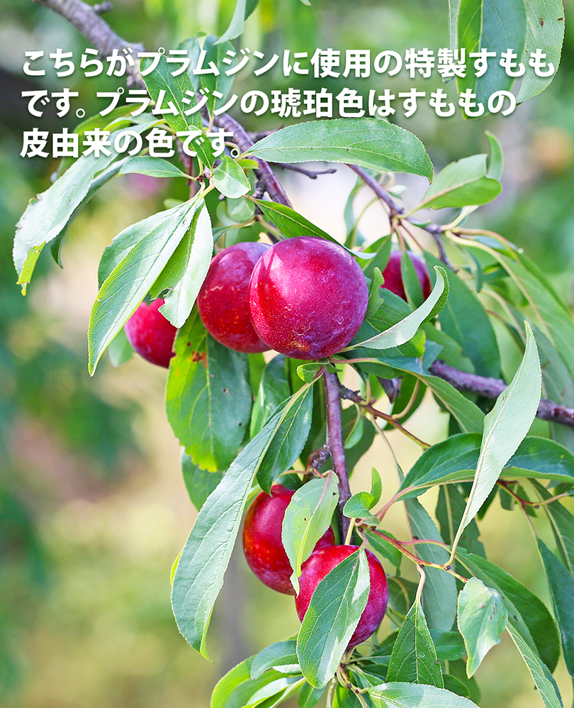 プラムジンの琥珀色は、すももの赤褐色の色。すももの酸味と甜菜糖のやさしい甘みをお楽しみいただけ