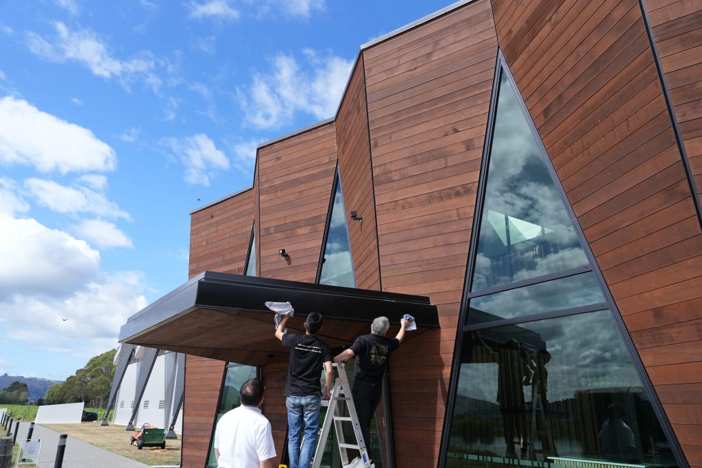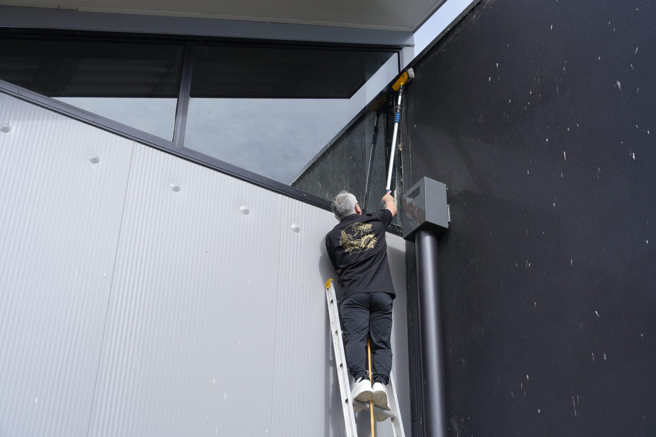 外周の掃除の後は、西が、約7m上まで登り、ブラシやジェットを使って、隅々まで掃除を行いました。