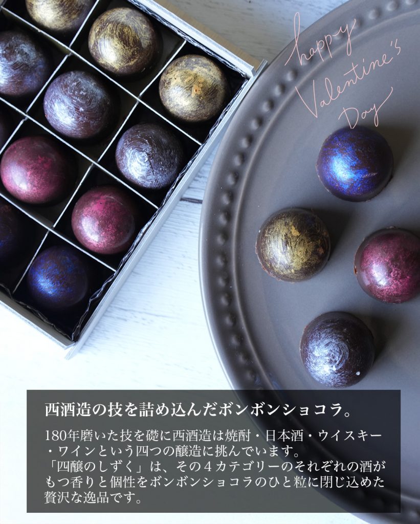 焼酎、ウイスキー、日本酒、ワインの4カテゴリーのお酒を醸造する西酒造だからこそできる、4カテゴリーのお酒が入ったショコラです。