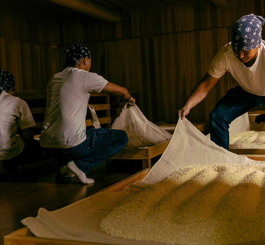蒸した米に、命を宿すように麹を造ります。1麹、2酒母(酛)、3造りと言われるように大切なのが麹造り。麹菌の繁殖を私たちの理想とする酵素力価になるように導きます。